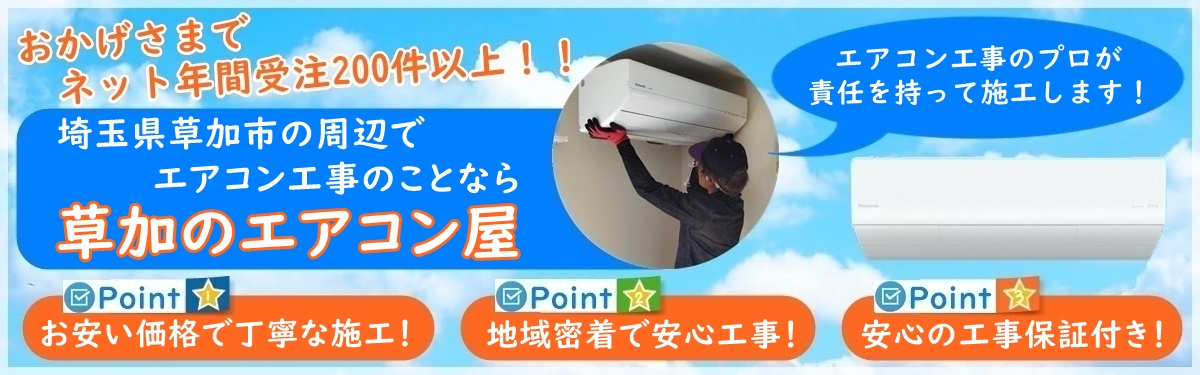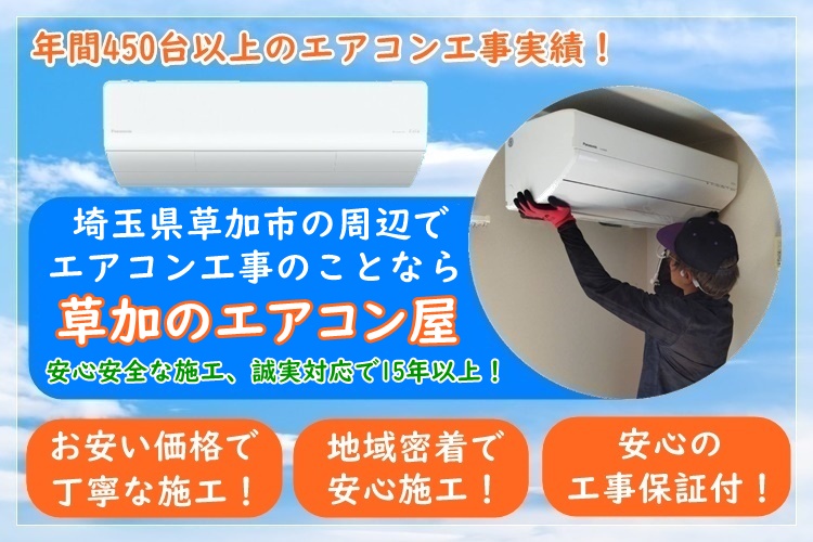 草加のエアコン屋は家庭用のエアコン工事を主にエアコン取り付け・取り外し工事をおこなっている地域密着のエアコン業者で、草加市を中心に埼玉県で活動しております。